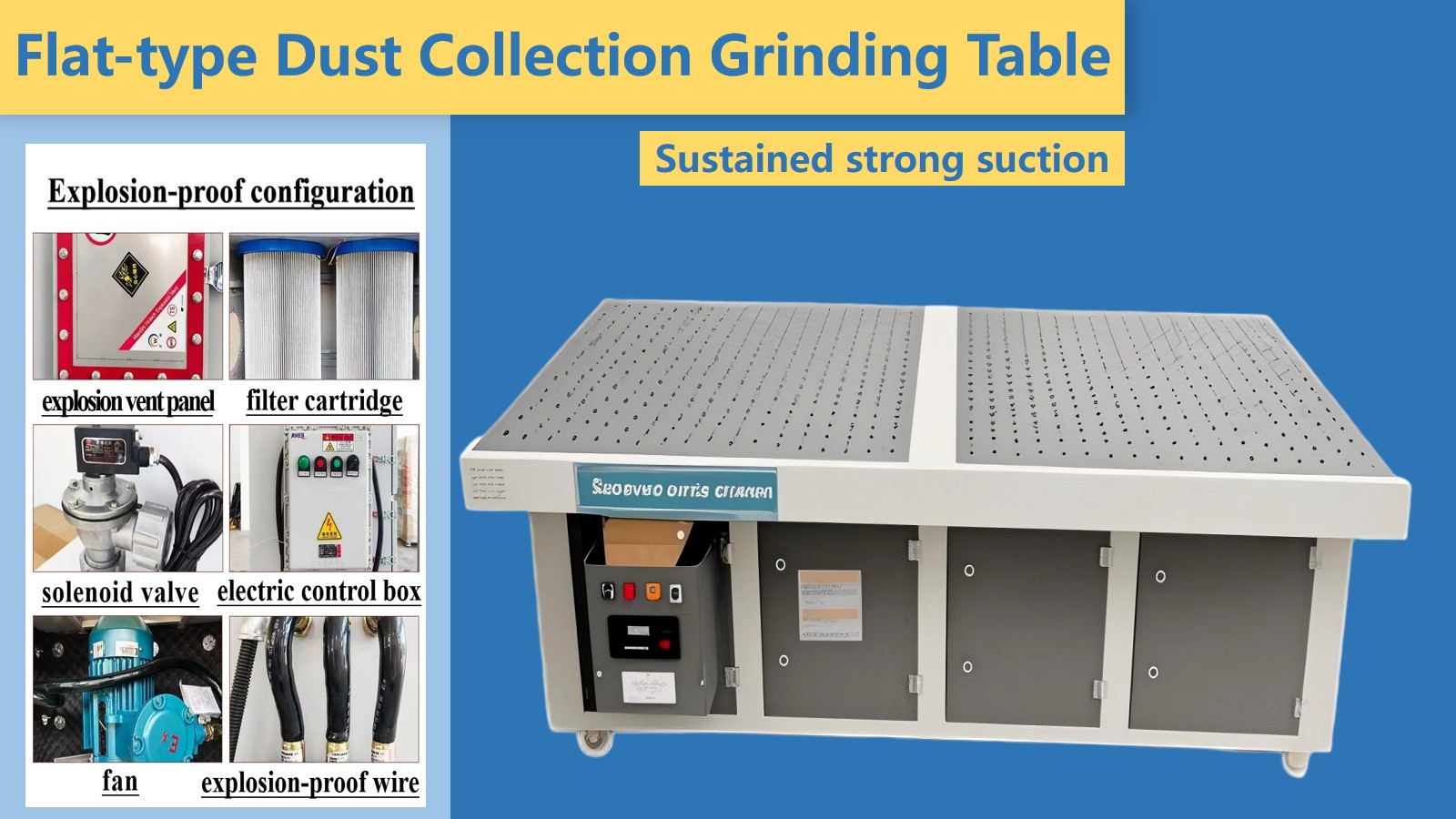Dobrý účinek sběru prachu: Rovina a strana plochého brusného stolu na prach jsou vybaveny sacími otvory, které mohou odstranit prach z více směrů a zlepšit účinnost sběru prachu.